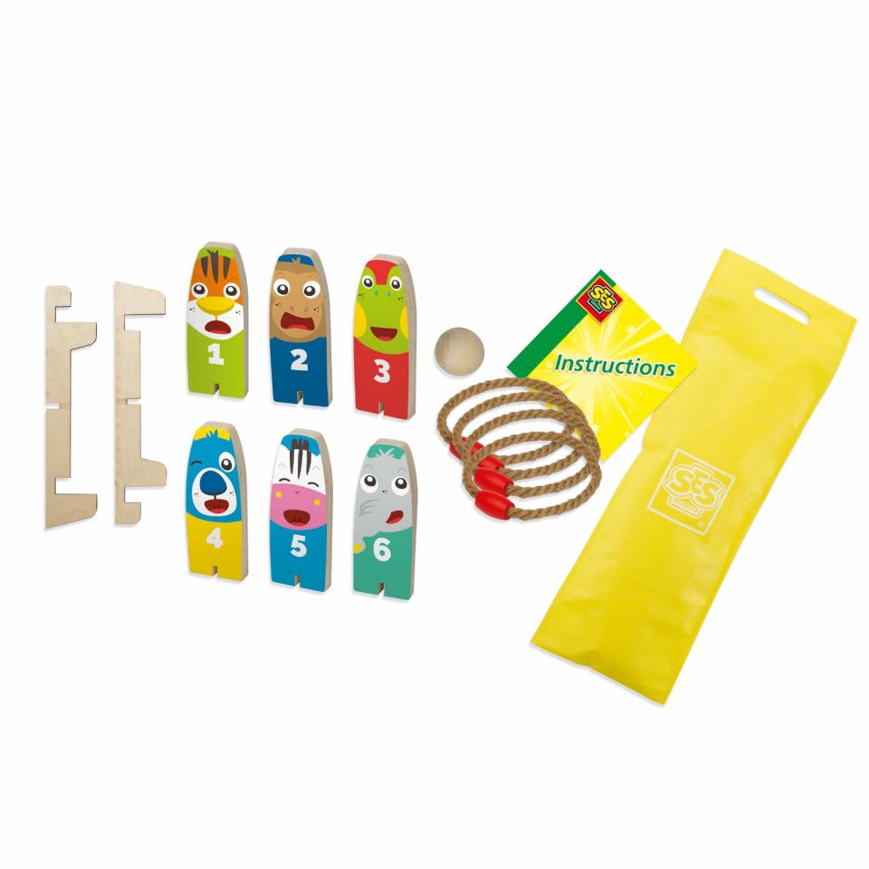 ¡Con este alegre grupo de animales puedes jugar nada menos que a dos juegos! Coloca los coloridos animales en un arreglo de bolos e intenta derribarlos con la pelota de una sola vez.