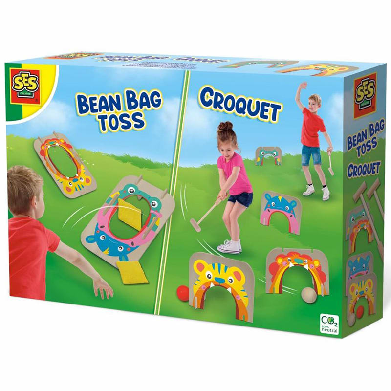 ¡Duplica la diversión al aire libre con el SES 2 In 1 Set Croquet Bean Bag Pack! Este paquete contiene no 1 sino 2 grandes juegos. ¡Lanza bolsas de frijoles con tus amigos y mira quién consigue la mayor cantidad de bolsas a través de los objetivos, o juega un juego de croquet!