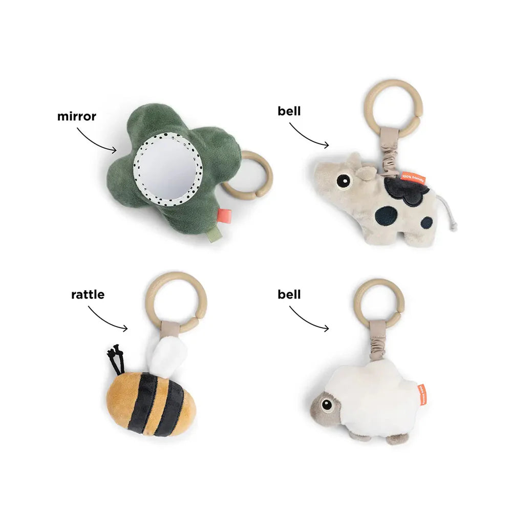 Material: Alfombra de juego: 100% poliéster. Juguetes: Tejido: 80% algodón 20% poliéster. Relleno: 100% fibras de poliéster (recicladas). El relleno de este juguete está fabricado con material reciclado procedente de una instalación certificada por GRS.