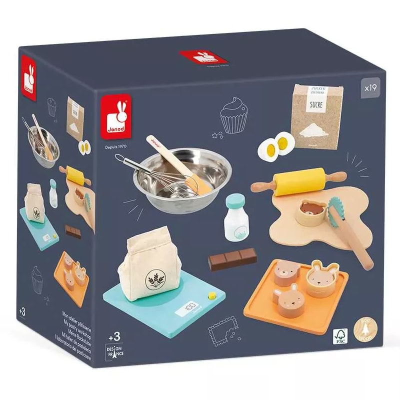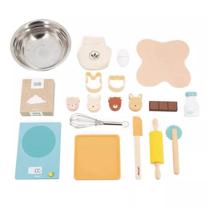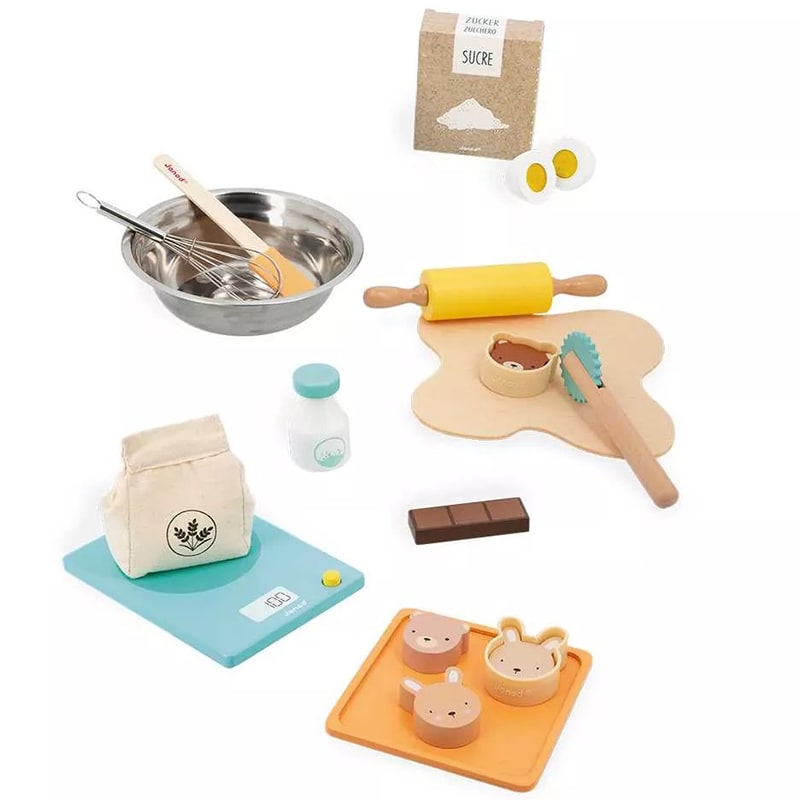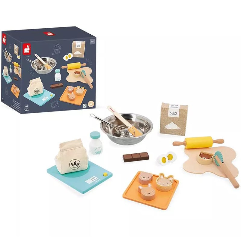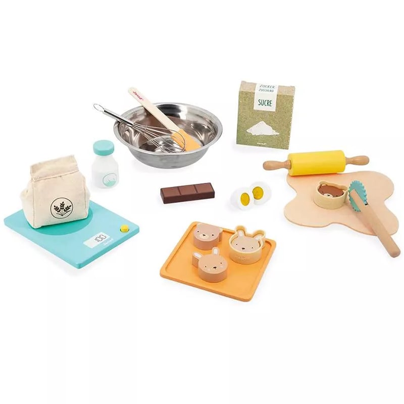 ¡Qué delicioso aroma emana de la minicocina de los niños! Para los pequeños golosos que adoran jugar a las comiditas, ¡nada mejor que este conjunto de accesorios de madera para hornear como los mayores! ¡En este pequeño taller encontrarán todo lo que necesitan para dar alas a su creatividad e imaginarse que son reconocidos pasteleros! Primer paso de la receta: pesar los ingredientes con la bonita báscula de madera. Una caja de azúcar de cartón, una bolsa de harina de tela, una botella de leche de madera, un huevo con cierre de velcro y una barra de chocolate viene incluidos en este kit de pastelería. ¡Para que los niños combinen ingredientes a su antojo! Se mezcla todo en el bol con el batidor de metal y se extiende la hermosa masa de fieltro usando el rodillo, adecuado para manos pequeñas. ¡Con la espátula no quedarán restos en el bol! ¿Qué forma vamos a dar a las galletas? ¿Por qué no hacer buñuelos con el cortapastas dentado? ¡Qué bonitos los dos moldes de silicona en forma de cabeza de oso y cabeza de conejo, con los que van a poder crear 4 pastelitos de animales de lo más encantador! Este producto está hecho de material certificado FSC® y otro material controlado.