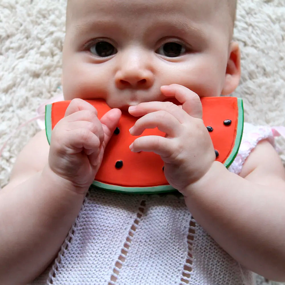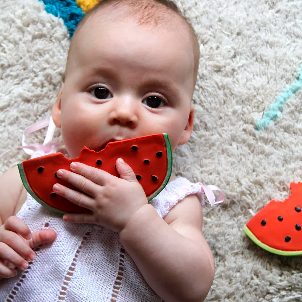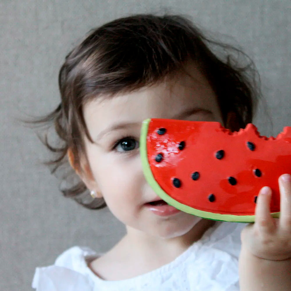 Este mordedor es perfecto para estimular el juego sensorial, para entretener a los niños y para aliviar las molestias de la dentición en las guaguas. Con una textura suave y un atractivo diseño, este mordedor es fácil de agarrar y de masticar. Fabricado y pintado a mano con pigmentos alimentarios, es biodegradable y ecológico.