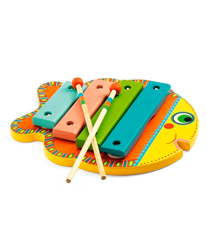 Lindo y colorido xilófono con forma de pez ¡Ideal para el primer instrumento musical de tu hijo! Un divertido instrumento con 4 diferentes sonidos y 2 baquetas para despertar en los pequeños el interés por la música..